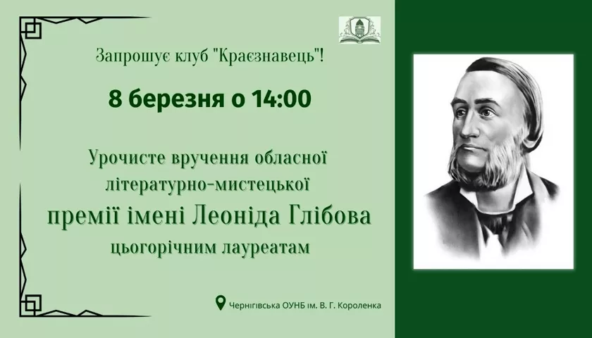 8 березня о 14:00 у читальній залі Чернігівської обласної універсальної наукової бібліотеки відбудеться урочисте вручення обласної літературно-мистецької премії імені Леоніда Глібова цьогорічним лауреатам.